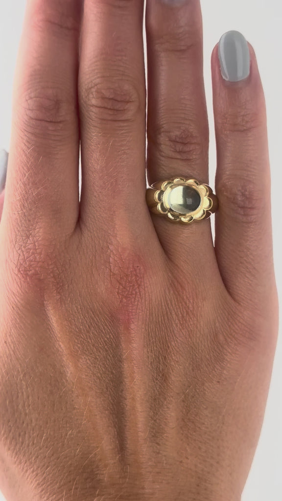 This high-domed Aquamarine cabochon catches light from every angle, appearing endless; it is set on a hand carved solid (and weighty!) signet surrounded with cupped petals.